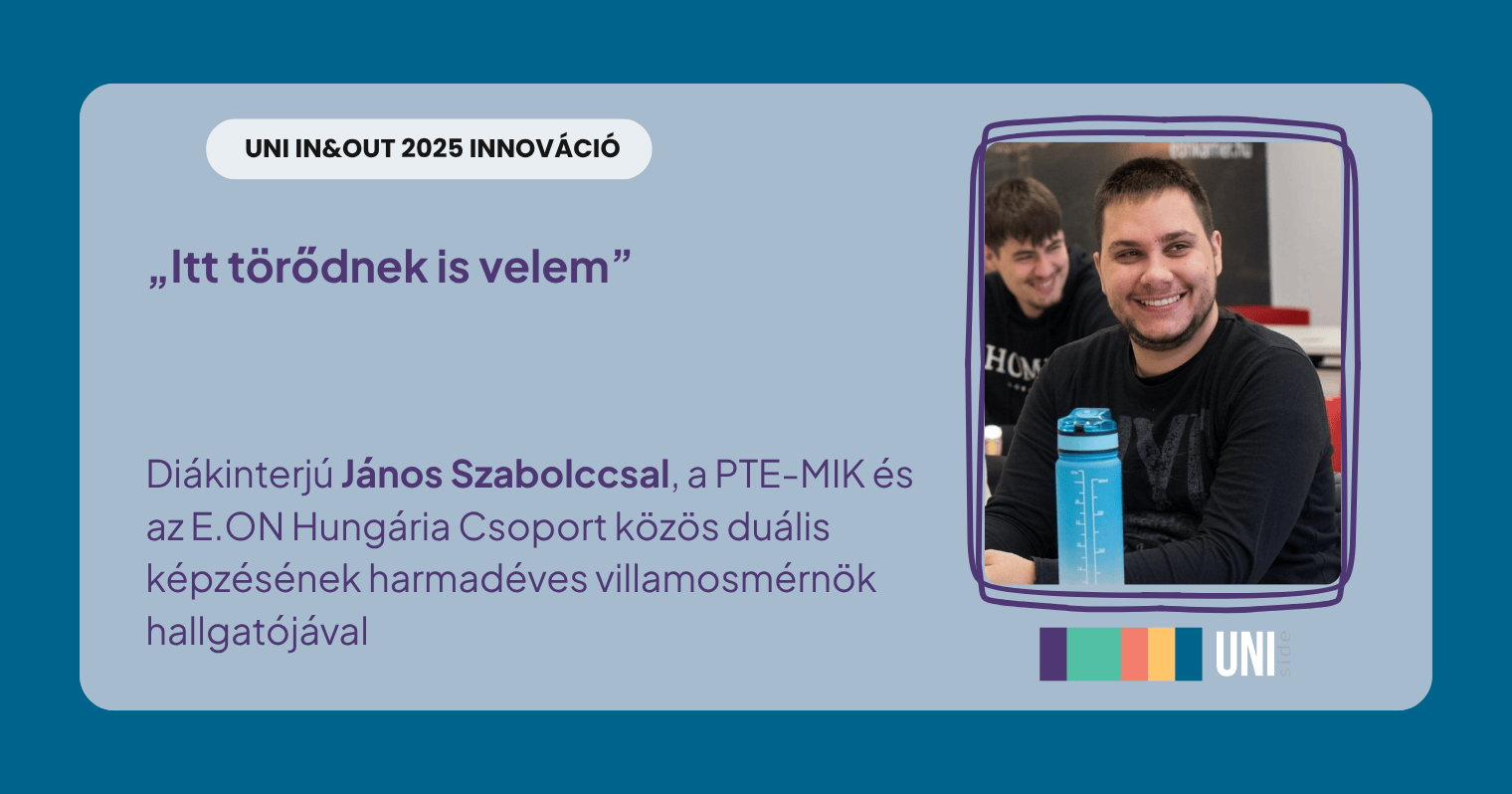 „A PTE-MIK-en az első félév végén lehet jelentkezni duális képzésre. Kaptunk egy listát a cégekről, és meg lehetett jelölni többet is. A találkozók után dőlt el bennem, hogy az E.ON-t szeretném választani, az ott elhangzottak győztek meg igazán. Azt ígérték, hogy a cég nemcsak minden hónapban átutalja a fizetést, hanem valódi lehetőséget is kapok mind az oktatás, mind a későbbi karrier, mind a juttatások terén” – mondta János Szabolcs, a Pécsi Tudományegyetem Műszaki és Informatikai Kar (PTE-MIK) és az E.ON Hungária Csoport közös duális képzés harmadéves villamosmérnök hallgatója.