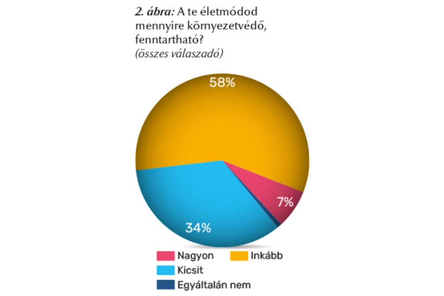Érdekes, hogy az idősebbek és a hölgyek tájékozottabbak, ami jelezheti, hogy idővel szélesednek az ismeretek, illetve hogy a női válaszadók érzékenyebbek, fogékonyabbak a zöldtémák iránt, és emiatt tájékozottabbak. A nők gyakrabban társítják a fenntarthatósághoz a fair trade-et (39 százalék), mint a férfiak (26), vagy a humánus munkahelyi környezetet (42 százalék, szemben a 22-vel). Arra is rákérdeztünk, mennyire tartják fenntarthatónak a saját élet módjukat, és szerintük mely tényezők a legfőbb akadályai annak, hogy valaki környezettudatos döntéseket hozzon. A válaszadók több mint fele úgy gondolja, hogy inkább környezettudatos, ám mindössze 7 százalékuk mondta azt, hogy valóban nagyon környezetbarát életvitelt folytat (2. ábra). Fontos kérdés, hogy az egyetemisták hogyan viszonyulnak a környezetvédelem társadalmi megítéléséhez: vajon unalmas témának tartják, vagy épp a jövő kulcskérdésének. Harminckilenc százalékuk úgy véli, hogy ha többen vennék komolyan a fenntarthatóságot, akkor hatékonyabb lenne az összefogás a kérdésben, míg 26 százalékuk számára fontosak a fenntarthatósági kérdések, de úgy érzik, az eredmény nem rajtuk múlik.