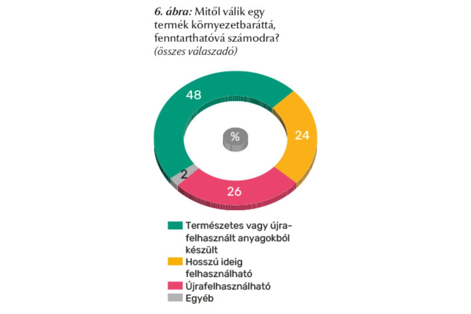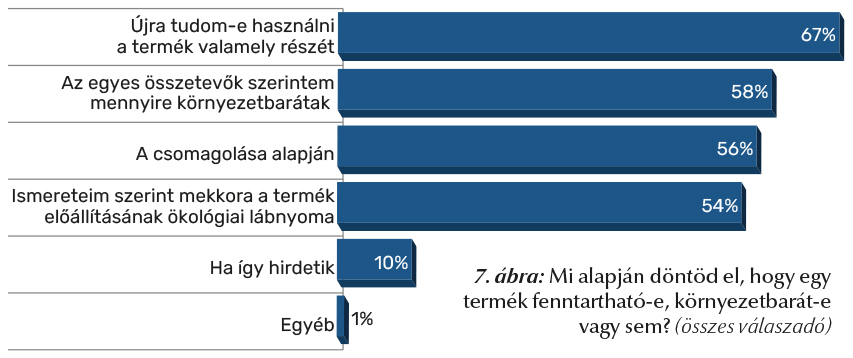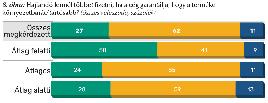 A felmérésben kitértünk a személyes motivációkra is: mitől válik egy termék környezetbaráttá a válaszadók szemében, illetve hogyan döntik el, hogy fenntarthatónak minősül-e a megvásárolt árucikk (6–7. ábra). Az egyetemisták 27 százaléka különösebb feltétel támasztása nélkül, 62 százalékuk a termék egyéb jellemzőinek figyelembevétele mellett hajlandónak mutatkozik egy termékért többet is fizetni, ha a gyártó garantálja, hogy az környezetbarát vagy akár az tartósabb (8. ábra). A hallgatók válaszai a jövedelmi helyzetükkel függött össze: azoknak a fele, akiknek átlag feletti a jövedelmük, minden további nélkül hajlandók többet is fizetni, illetve – ha csak kismértékben is, de – a jövedelmi helyzet javulásával a fizetési hajlandóság elvi lehetősége is növekedni látszik.