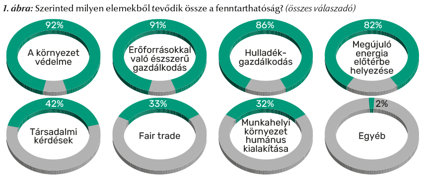 A kutatás elsőként azt vizsgálta, mit értenek a hallgatók a fenntarthatóság fogalma alatt, a környezet védelmétől a megújuló energiaforrások előtérbe helyezésén át egészen a társadalmi kérdésekig, az etikus kereskedelemig vagy a munkahelyi környezet minőségéig. Kiderült, hogy a fenntarthatóság fogalmát szűken értelmezik. Tízből nyolcan ugyanis az erőforrásokkal való ésszerű gazdálkodást és a megújuló energiát tartják a legfontosabbnak, miközben az olyan tényezők, mint a méltányos kereskedelem vagy a humánus munka helyi környezet jóval kevesebbeknél jelent meg (1. ábra).