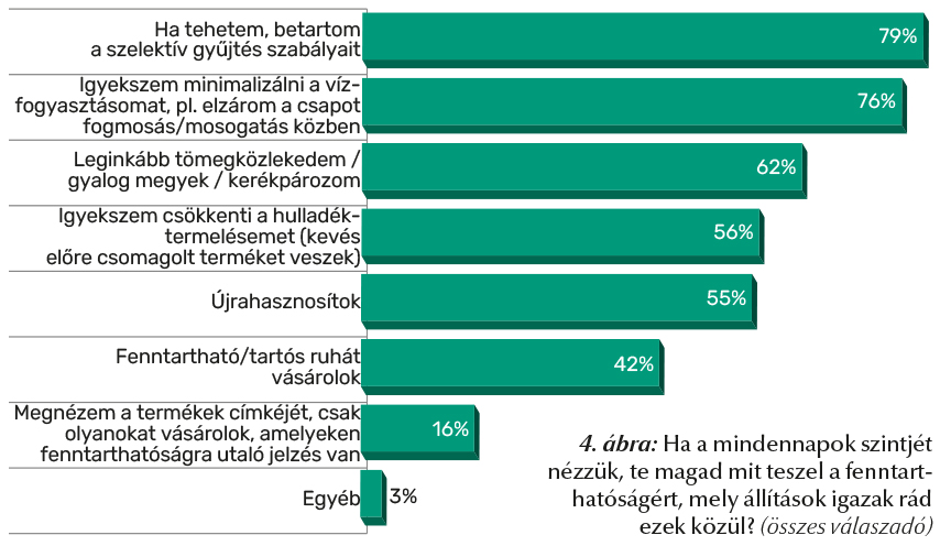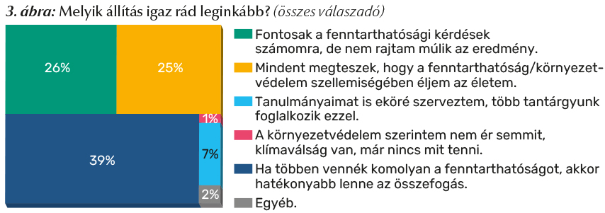 Körülbelül ugyan- ilyen arányban vannak azok, akik úgy vélik, mindent megtesznek azért, hogy a fenntarthatóság, a környezetvédelem szellemiségében éljék az életüket. A válaszadók további 7 százaléka számára annyira fontos a környezetvédelem, hogy a tanulmányait is eköré szervezte, több tantárgya is ezzel foglalkozik. Száz hallgatóból mindössze egy olyan akad, aki igencsak kiábrándult: szerinte a környezetvédelem nem ér semmit, hiszen klímaválság van, és ebben a helyzetben már nincs mit tenni (3. ábra). A kutatás egyik legjellemzőbb tanulsága, hogy a fiatalok jelentős része nem érzi magát valódi döntési helyzetben. A válaszadók több mint egynegyede gondolja úgy, hogy a fenntarthatóság fontos, de az eredmény nem rajta múlik. Ez a hozzáállás különösen a fiatalabb, a műszaki vagy informatikai képzésen tanuló fővárosi férfiaknál volt megfigyelhető.