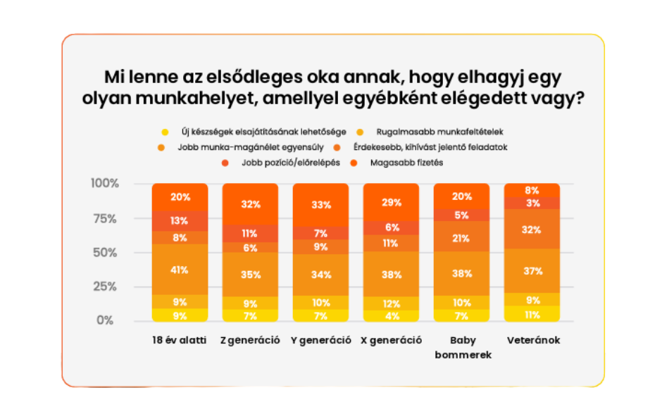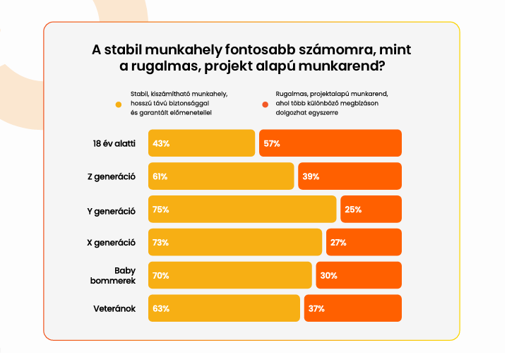 A fiatalok 58 százaléka számára a tanulás és az önfejlesztés kiemelt fontosságú. Ez azt jelenti, hogy egy munkahely értéke már nem a pozíció vagy a belépési bér nagysága, hanem az, hogy milyen gyorsan lehet új készségeket szerezni, és mennyire átlátható a fejlődési út. A Z generáció sokkal rövidebb karrierciklusokban gondolkodik, és 3–4 év alatt szeretné elérni a maximumot egy munkahelyen. A cégeknek ezért a hagyományos, évtizedes előmeneteli modellek helyett gyorsított, rugalmas karrierutakat kell kínálniuk.